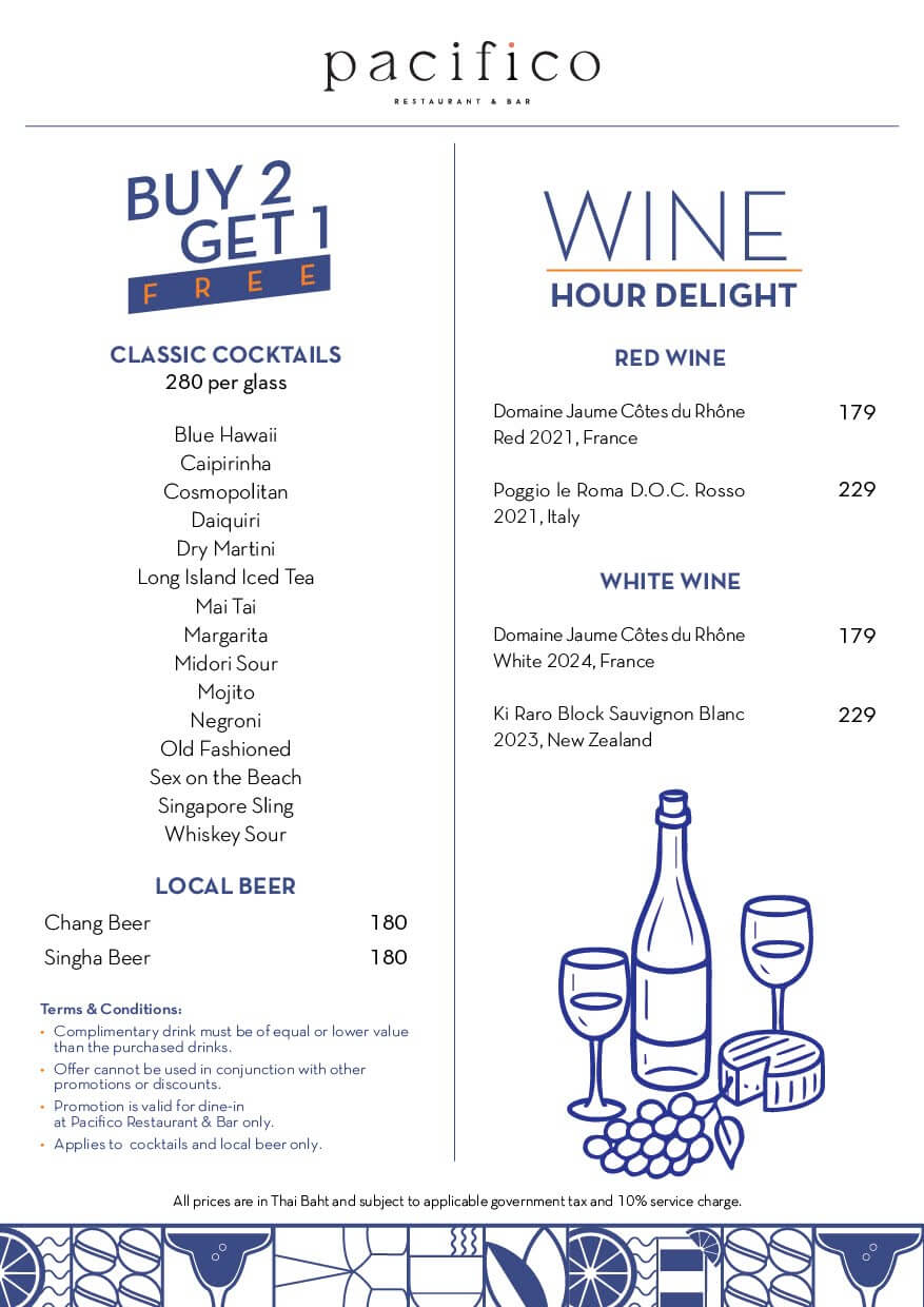- Promotion is valid for dine-in at Pacifico Restaurant & Bar only.